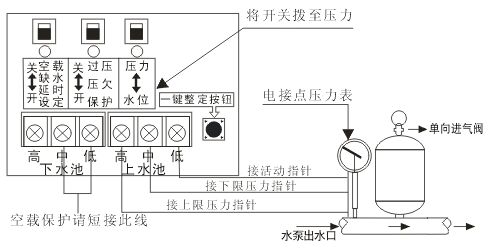 7、壓力接法:將控制器“壓力/水池”選擇開關(guān)(在訊號(hào)線接線端子上端)撥到“壓力”檔,然后將上水池訊號(hào)線高中低水位與電接點(diǎn)壓力表高中低壓力位對(duì)接。