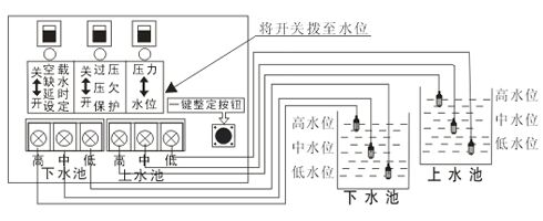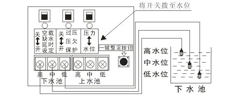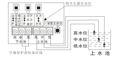 設(shè)置空載保護(hù)后,下水池不能接探頭。上水池的水用到中水位時(shí)會(huì)開始抽水,抽到高水位會(huì)水滿停機(jī),低水位訊號(hào)線起回路作用。