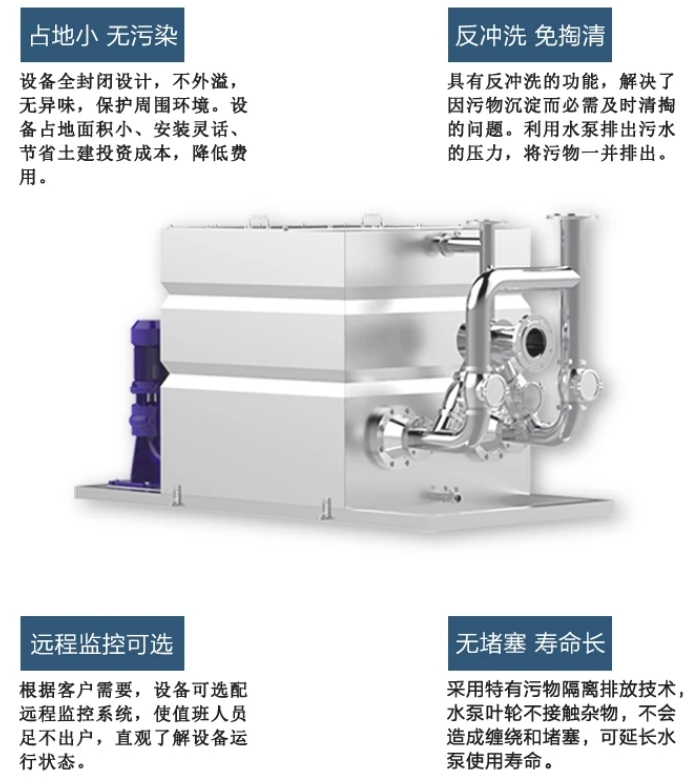 3、固液分離反沖洗型:可以內(nèi)外置(污水提升設(shè)備進(jìn)水前端2套固液分離器,分離進(jìn)水前端液體,通過(guò)集污箱液體反沖出至管道抽排至地上污水井內(nèi)。